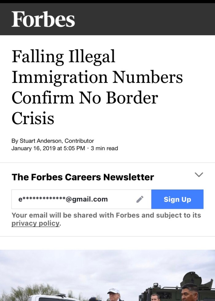 A recent article in Forbes states that immigration is falling and there is no national crisis.Trumps whole premise of his argument is that there’s a national security issue because immigration numbers are so high and we are basically getting invaded as Trump would say. But cording to Forbes magazine in the least in article Forbes states that the statistics show that immigration is falling and that we are all safe read the link below.