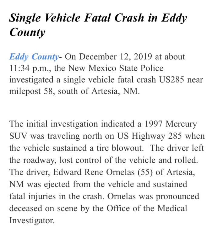 Featured Stories Fatal Crash in Eddy County By DukeCityTimes.com on December 13, 2019 • ( Leave a comment ) Share this: Share on X (Opens in new window) X Share on Facebook (Opens in new window) Facebook Like Loading... Related Categories: Featured Stories