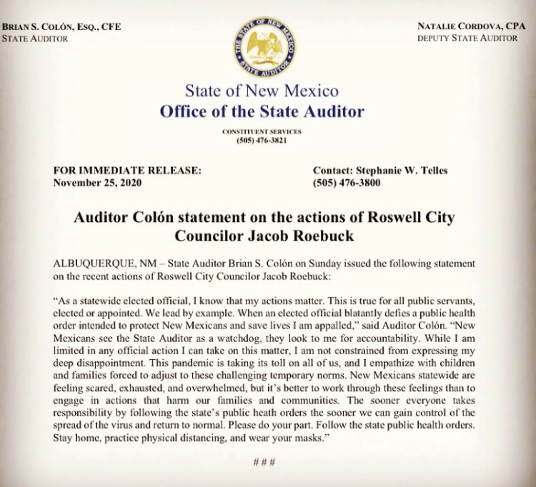 Featured Stories New Mexico State Auditor Brian Colon issues Statement regarding Roswell City Councilor. By DukeCityTimes.com on November 25, 2020 • ( Leave a comment ) Share this: Click to share on X (Opens in new window) X Click to share on Facebook (Opens in new window) Facebook Like Loading... Related Categories: Featured Stories